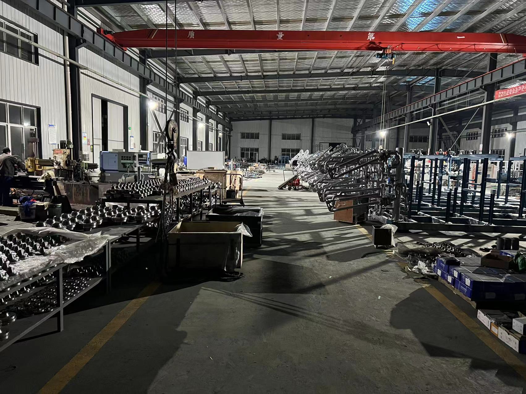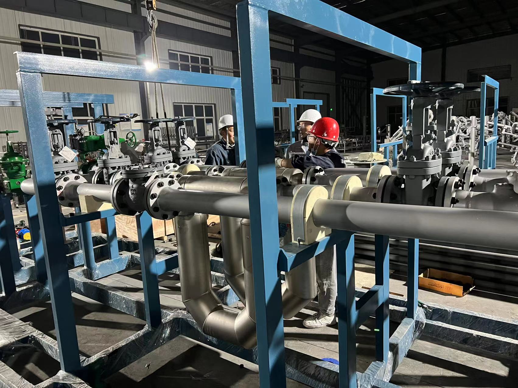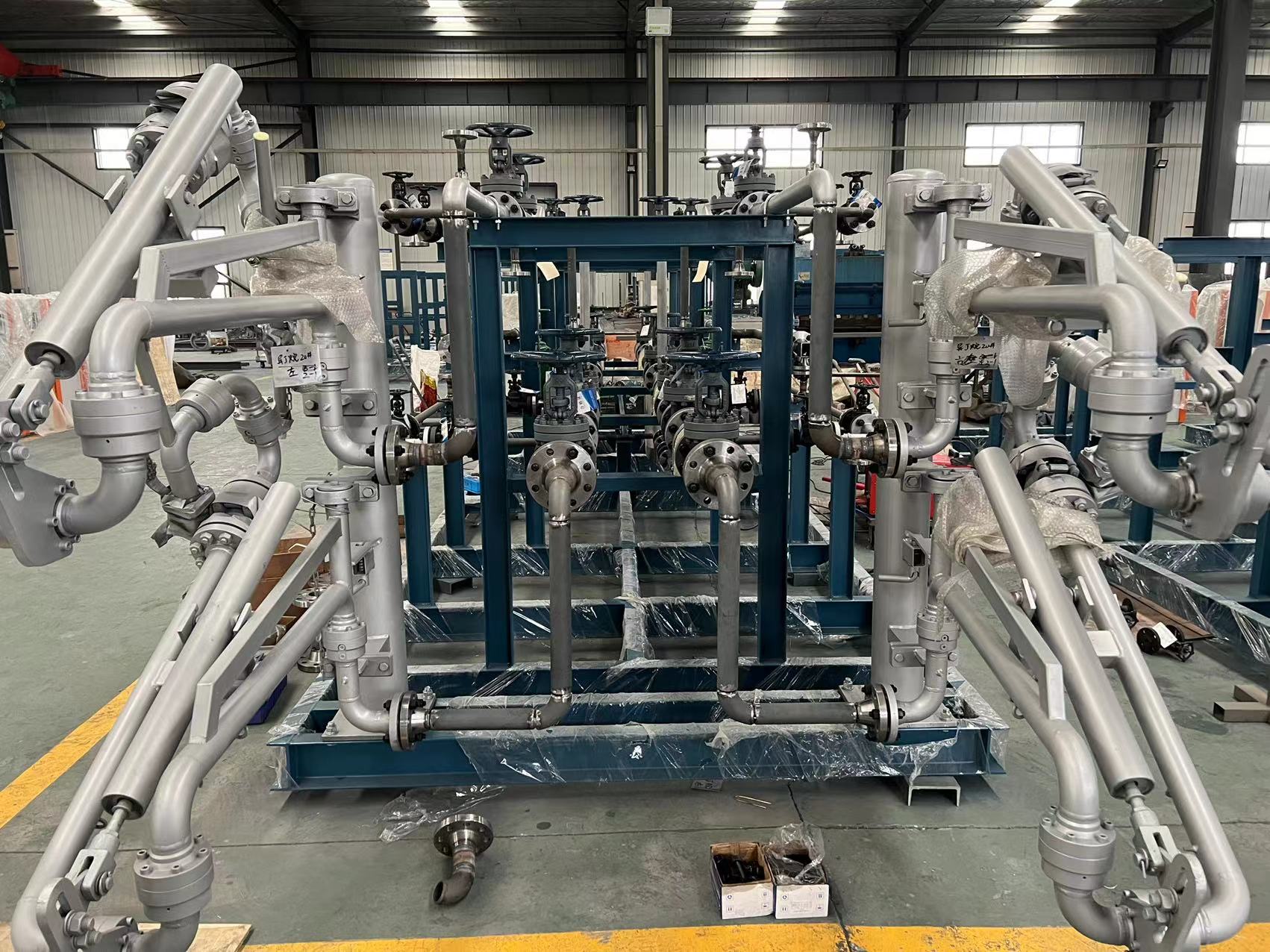 液化烴類(lèi)介質(zhì)槽車(chē)裝車(chē)系統(tǒng)比油品槽車(chē)裝車(chē)系統(tǒng)復(fù)雜,現(xiàn)場(chǎng)組配裝車(chē)系統(tǒng),安裝和調(diào)試周期長(zhǎng),質(zhì)量不穩(wěn)定。為克服以上缺點(diǎn),在工廠(chǎng)內(nèi),將裝車(chē)系統(tǒng)的儀表和設(shè)備集成在一個(gè)橇裝架上,并完成電氣安裝、強(qiáng)度試驗(yàn)和低溫測(cè)試等,裝車(chē)橇到達(dá)用戶(hù)裝車(chē)現(xiàn)場(chǎng)后,接地角螺栓,連接工藝管線(xiàn)、通訊和供電線(xiàn)路就可以使用。結(jié)合液化烴類(lèi)介質(zhì)裝車(chē)橇技術(shù)特點(diǎn),對(duì)液化烴裝車(chē)系統(tǒng)中的設(shè)計(jì)數(shù)據(jù)、功能要求、操作方法進(jìn)行敘述,綜合國(guó)內(nèi)裝車(chē)系統(tǒng)在使用中出現(xiàn)的問(wèn)題提出了解決辦法。以下為公司近期液化烴類(lèi)裝車(chē)撬的生產(chǎn)現(xiàn)場(chǎng)。
